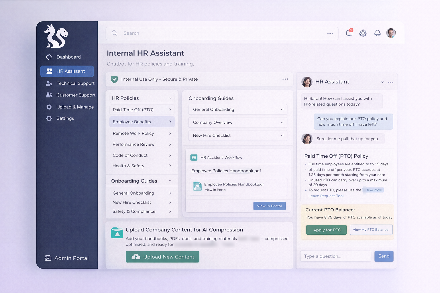 Trained on company policies, benefits info, onboarding docs, and leave rules. Answers questions like 'How do I request PTO?' or 'What's our parental leave policy?' without needing HR's time.