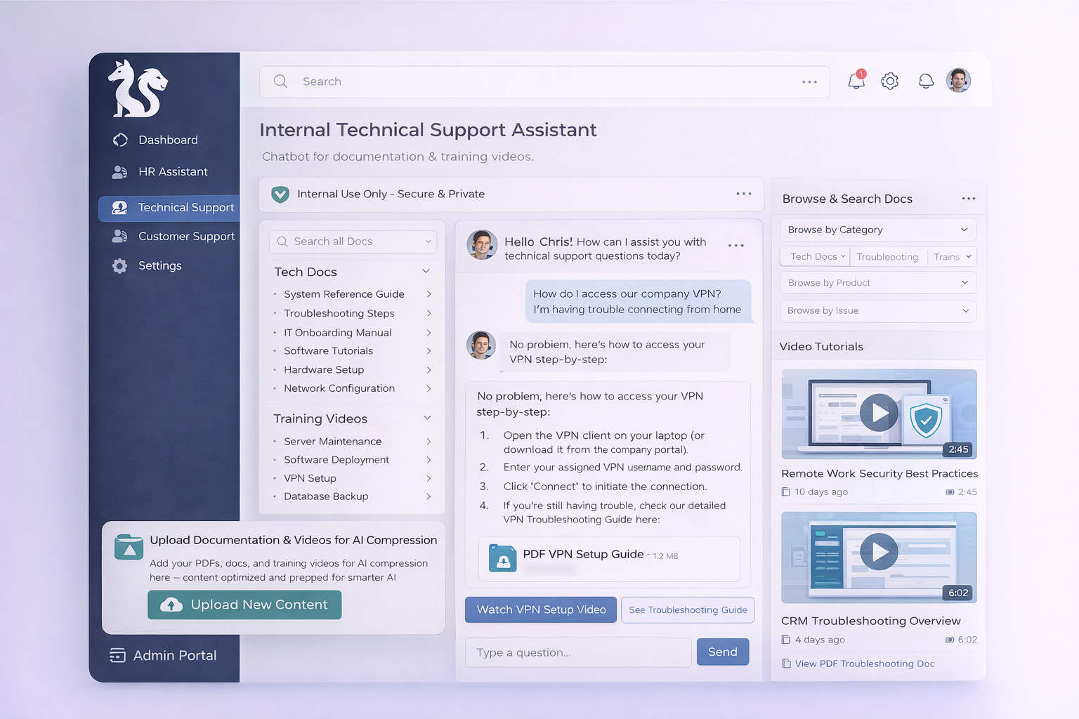 Knows your internal tools, troubleshooting steps, and system configurations. Handles questions like 'How do I reset my VPN?' or 'What's the process for requesting new software?'