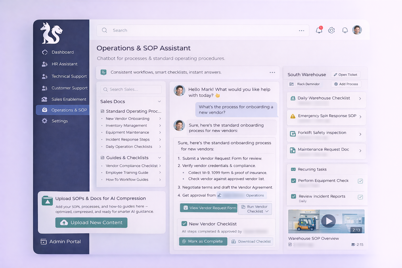 Trained on your SOPs, workflows, and internal processes. Answers questions like 'What's the approval chain for vendor payments?' or 'How do I request access to X system?'
