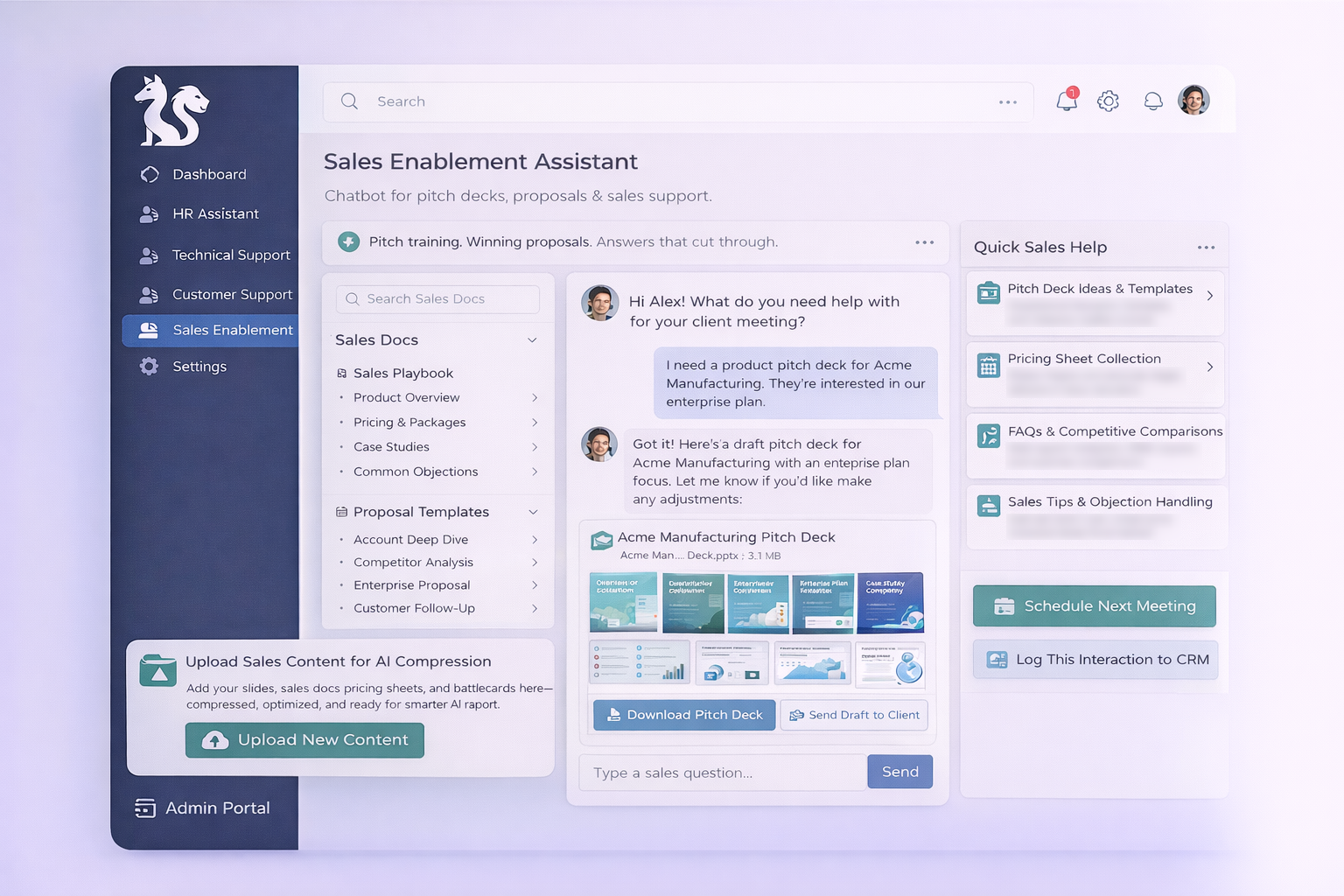 Knows your products, pricing, objections, and competitor comparisons. Helps reps prep for calls, answer technical questions, and find the right case study or one-pager in seconds.