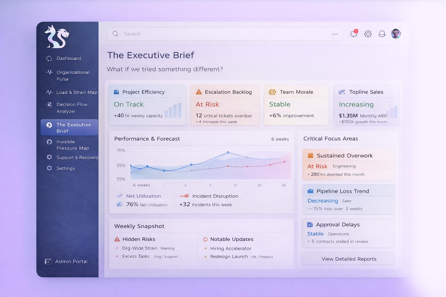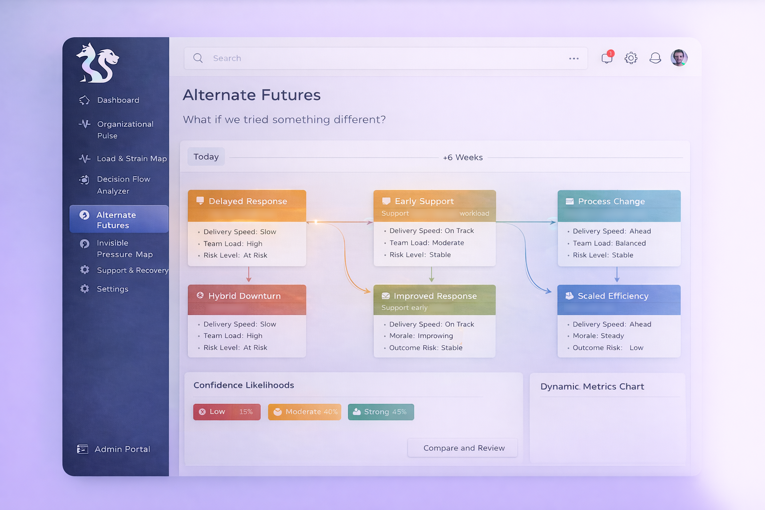 Lets leaders explore delayed intervention, early support, process changes, and workload redistribution. Simulates outcomes without real-world risk — like time travel for decision-making.