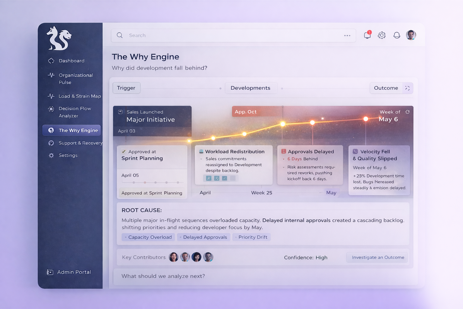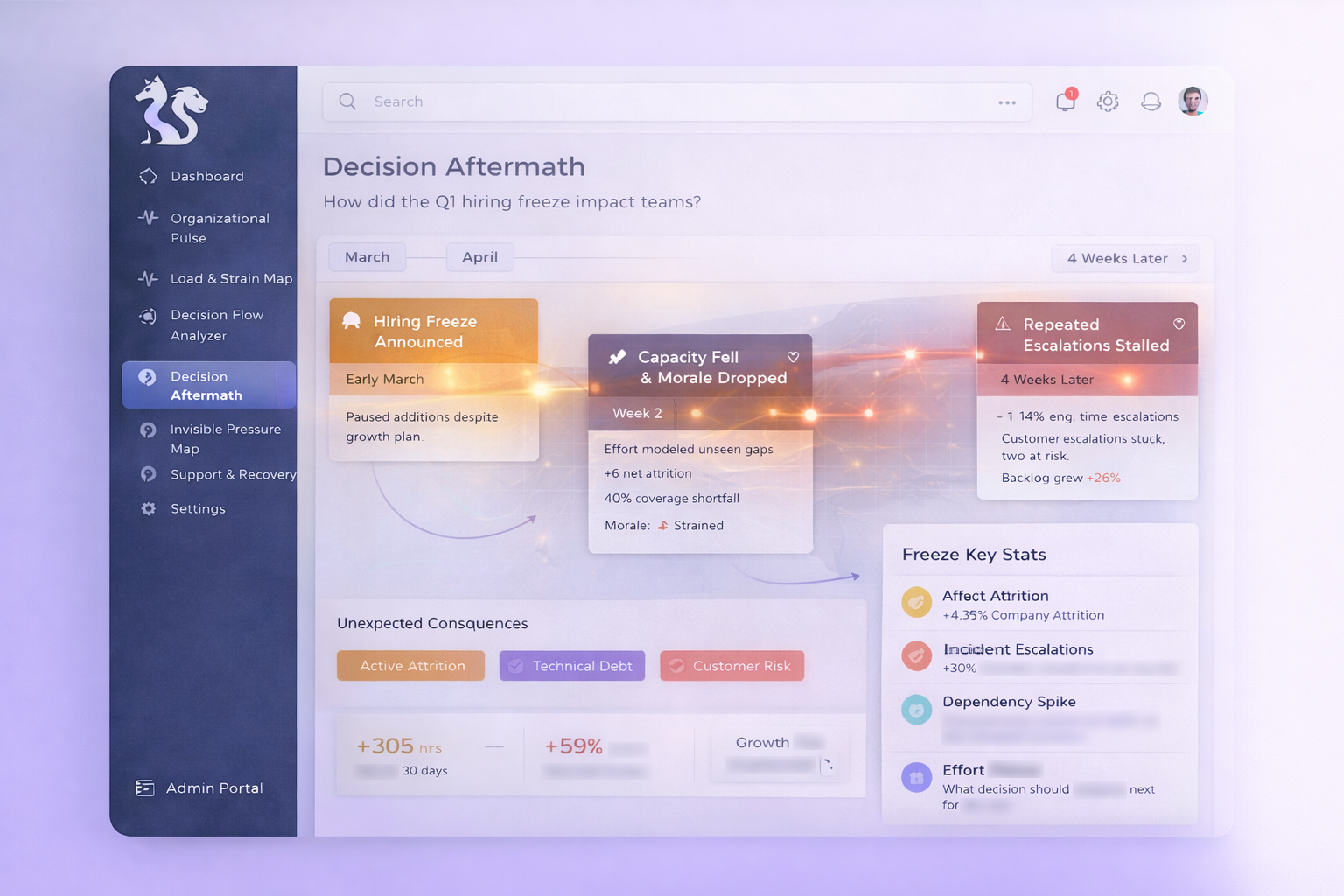 Analyzes downstream impact over time: velocity changes, morale signals, workload redistribution, and unintended consequences. Shows how one decision ripples through the organization weeks later.