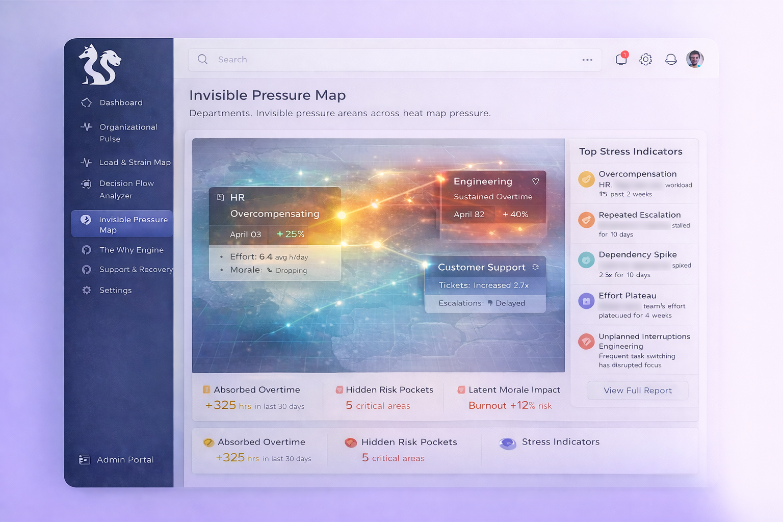 Visualizes latent pressure inside the organization — effort that's being absorbed but not recorded (overcompensation, hidden overtime, dependency overload). Reveals problems before they appear in KPIs.