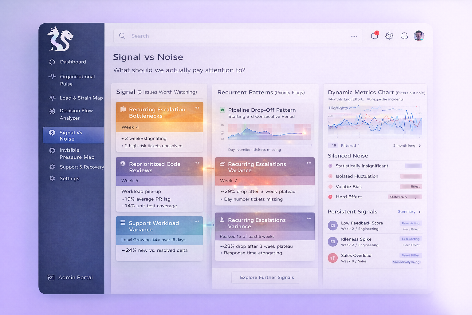 Filters out volatile data and highlights consistent patterns, slow drift, repeating failure signatures, and meaningful deviations. Helps leaders focus on what matters — not what's loud.