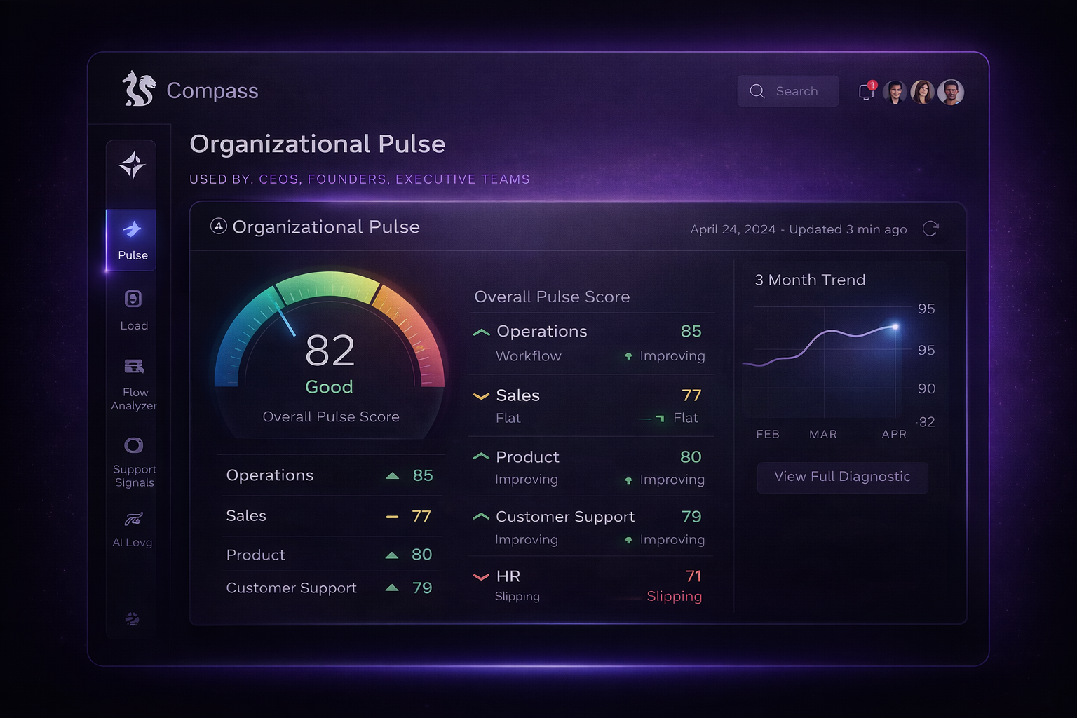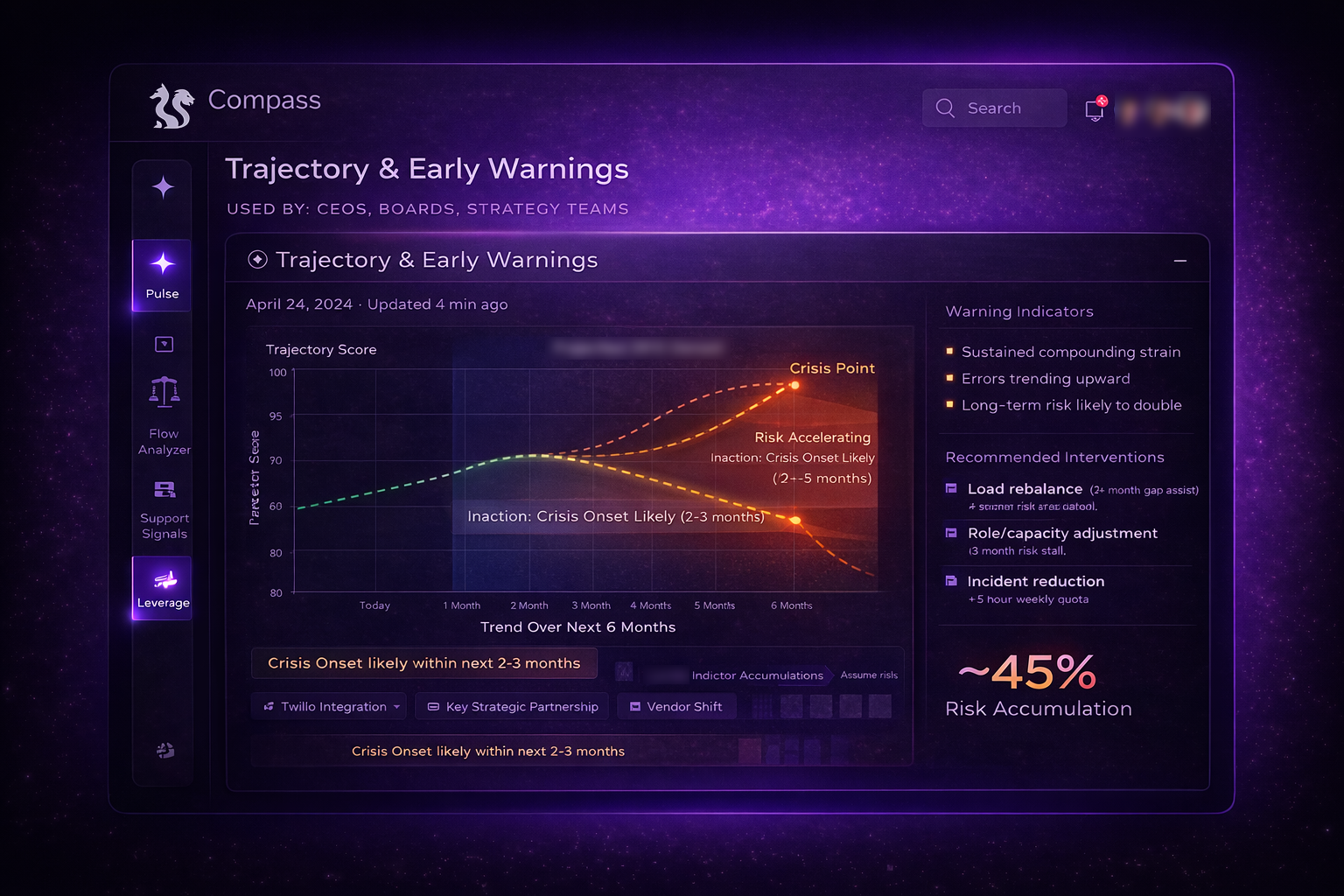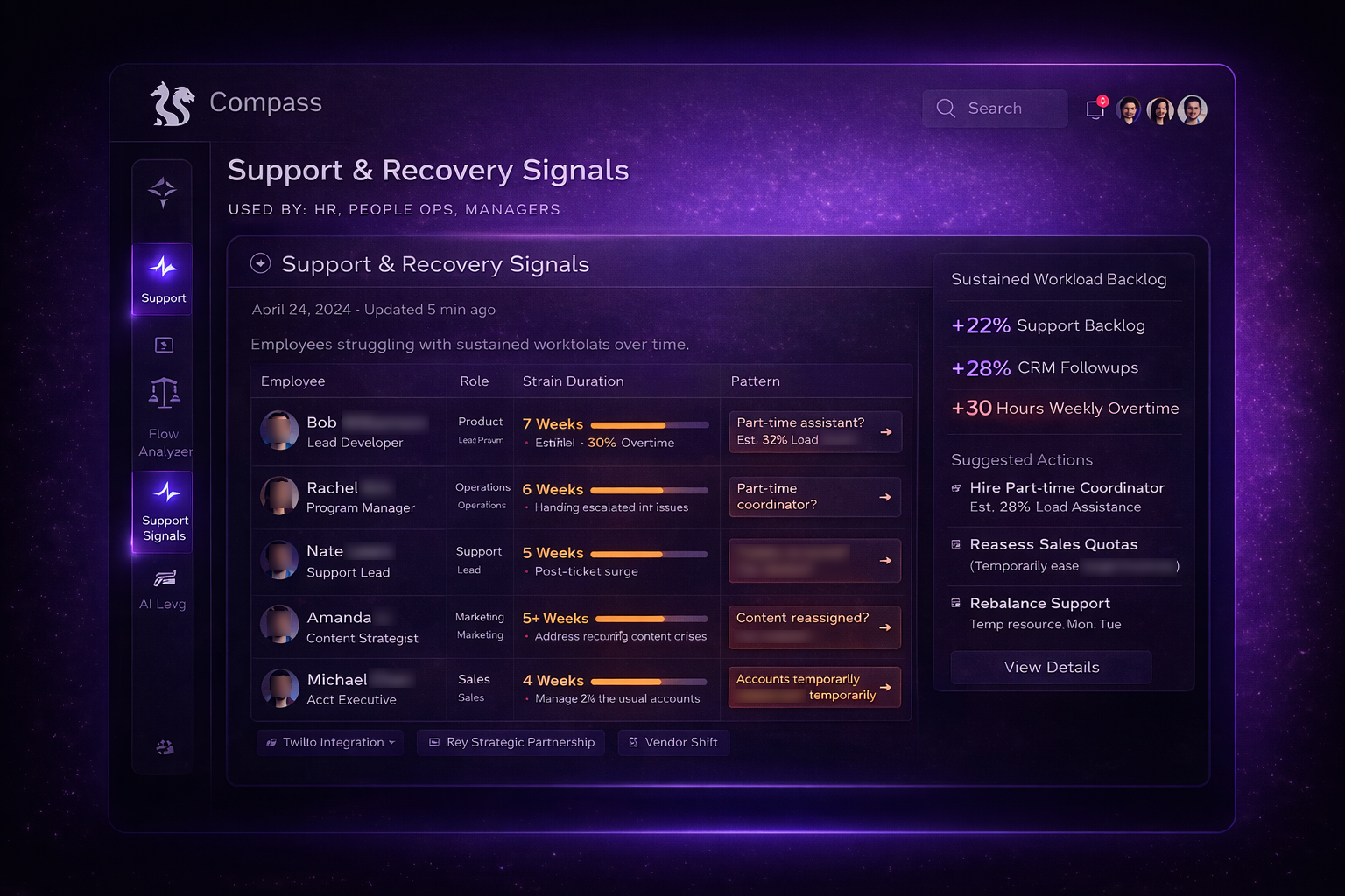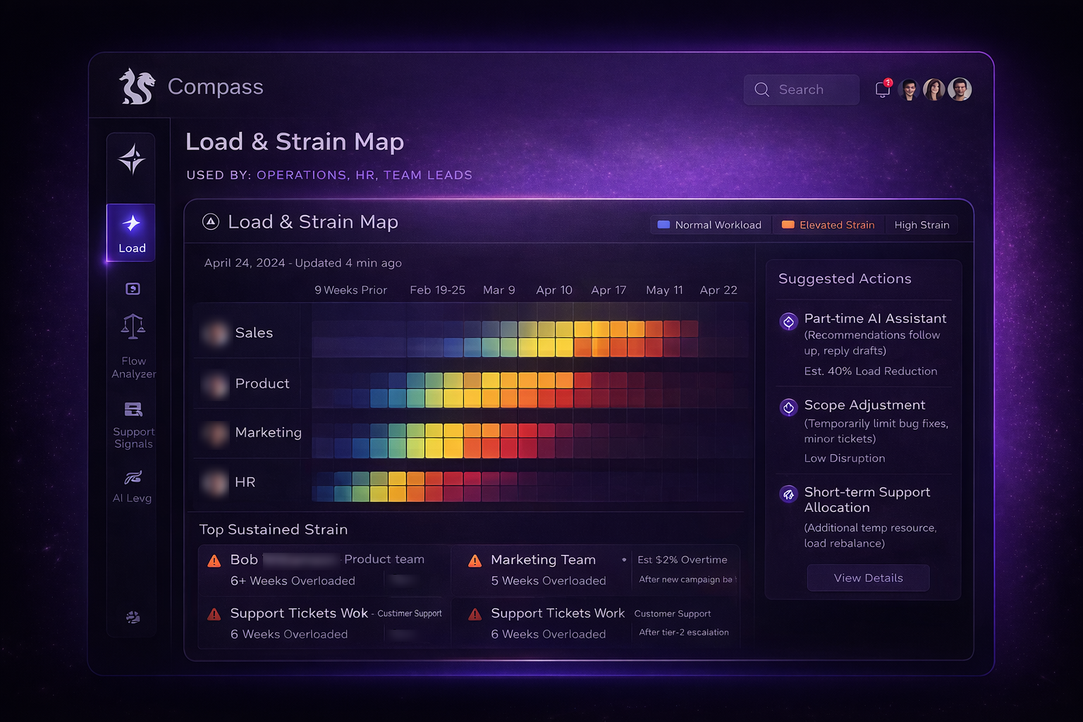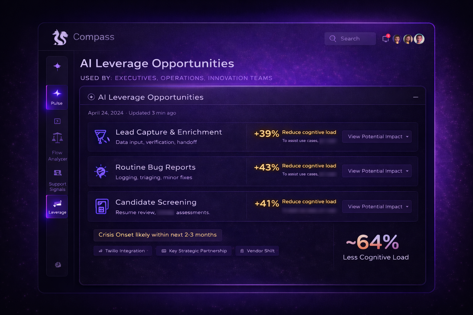 Compass allows leadership to see when someone has been carrying extra weight for too long, where AI could remove unnecessary load, and how long risks have been forming.
